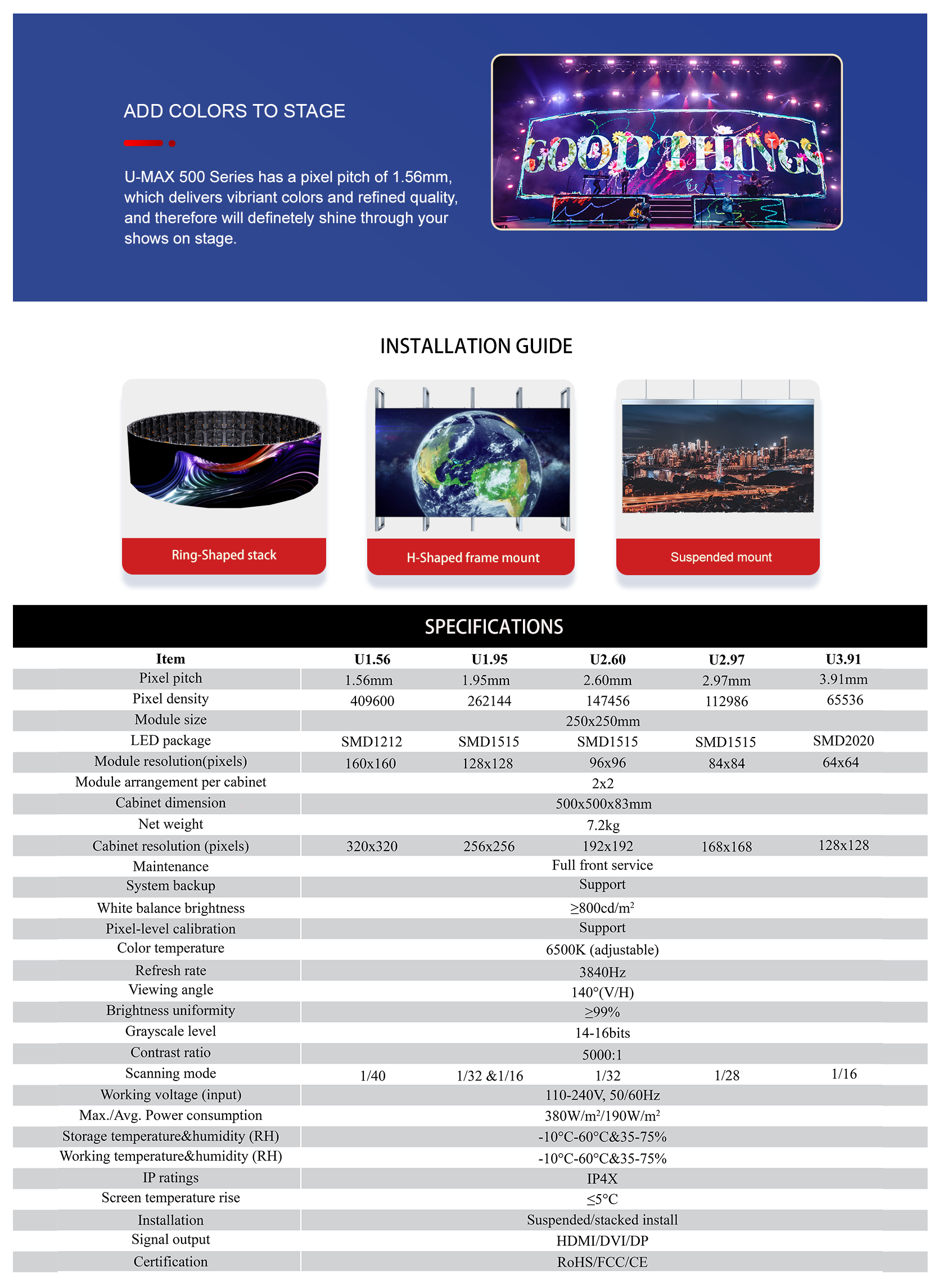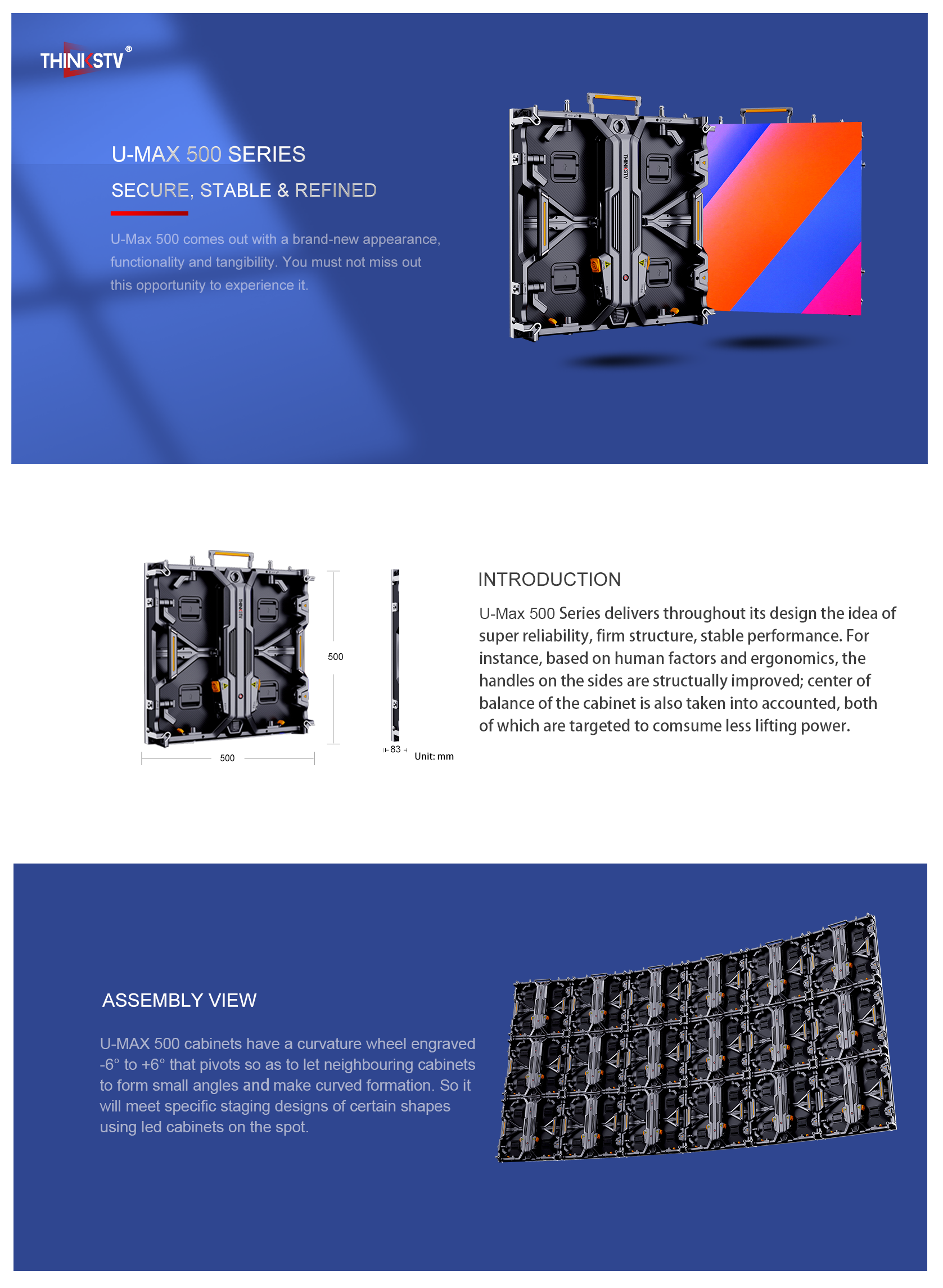 UMax offers excellent visual quality and creative options that assemble with the precision and ease. The cabinets arae easy to mount, stacking or hanging, allowing for seamless installations that foster all imaginable solutions in stage design.